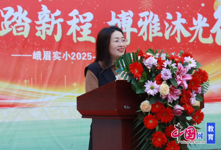 开学仪式正在庄沉而崇高的升旗典礼中拉开序幕。全体师生肃立瞩目,高唱国歌,心中激荡着对新学期的无限神驰取爱国激情。新学期,新期望。峨眉实小党总支张勤为全体师生奉上了热情弥漫的新学期寄语。张勤以“平安护航 健康成长 乐学博雅 朝阳雅行”为从题,强调了健康第一、平安至上的教育,寄语同窗们珍爱生命、守护健康,熬炼、阳光成长,热爱进修、积极向上,涵养风致、践行博雅,勉励全体师生正在新学期联袂同业,配合书写出色篇章。